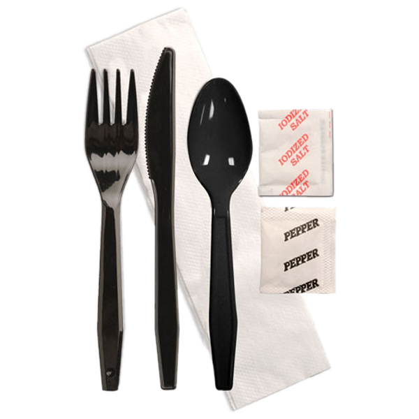 Save valuable time and have these 6 piece Cutlery Kits ready to accompany your take out meals. Everything your guests need for their meal is conveniently and hygenically sealed in a clear poly bag. Premium heavy weight untensils are suitable for any type of meal, including meats and pasta. Your guests will appreciate the attention to detail. Also available in Champagne. Each Kit contains: